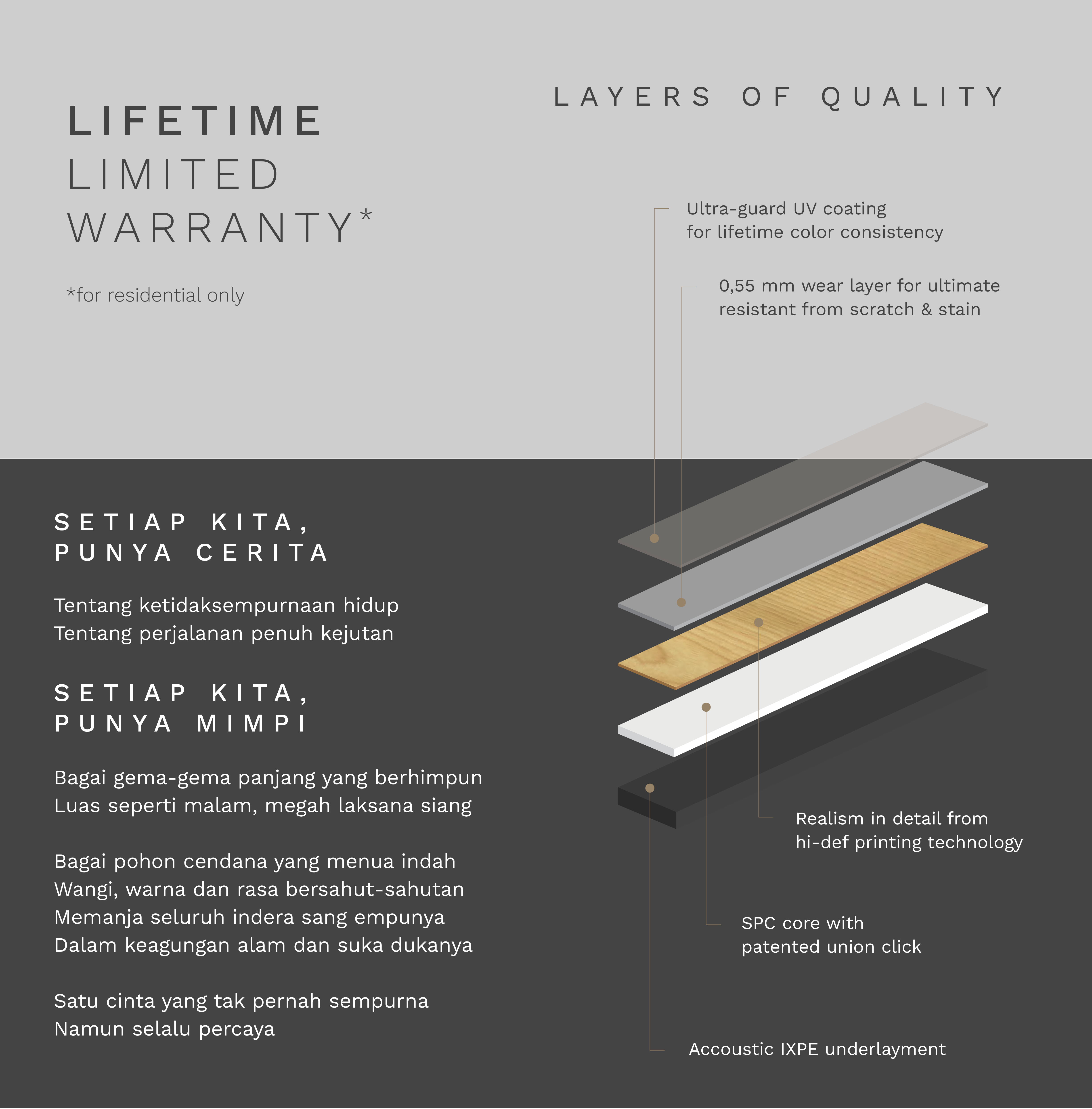 Signature+ adalah produk Commercial Grade LVP dari Almaflor. Didesain dengan ukuran plank XL membuat Signature+ terlihat sleek saat diaplikasikan di ruangan yang kecil maupuan luas. Signature+ dirancang untuk kebutuhan material lantai kaum urban dan eksekutif muda untuk nuansa ruang modern, natural namun tetap elegan.
